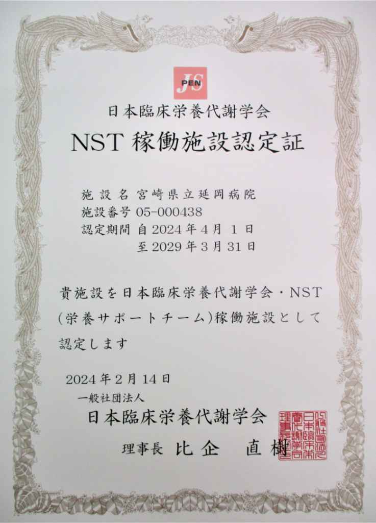 また、当院は、日本栄養治療学会NST専門療法士認定規定に基づく認定教育施設です。対象資格を有するものが同施設で合計40時間以上の実施修練を修了することで、NST専門療法士の資格取得要件の1つを満たすことができます。院外からの受講希望者にも対応していますので、興味がある方はお問い合わせください。