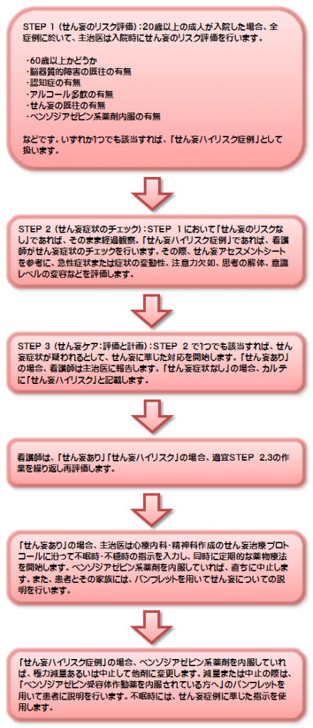 当院では、2014年11月よりDelirium Team Approach(DELTA)プログラムを導入しております。これは、国立がん研究センター東病院で開発されたプログラムで、各職種がチームとなって入院中の患者に生じるせん妄の予防、初期対応が出来るようにしたものです。せん妄によって生じる転倒・転落や点滴ルートの自己抜去などの医療事故の減少、速やかな対応による患者さんやその家族の動揺軽減、医療スタッフの対処スキル向上と疲弊軽減、入院期間の短縮などを目的としています。