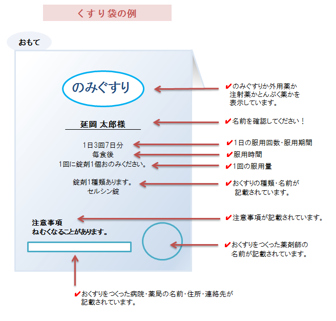 - くすりの袋(薬袋)には、くすりを正しく飲むための注意事項が書かれています。必ず確認しましょう。