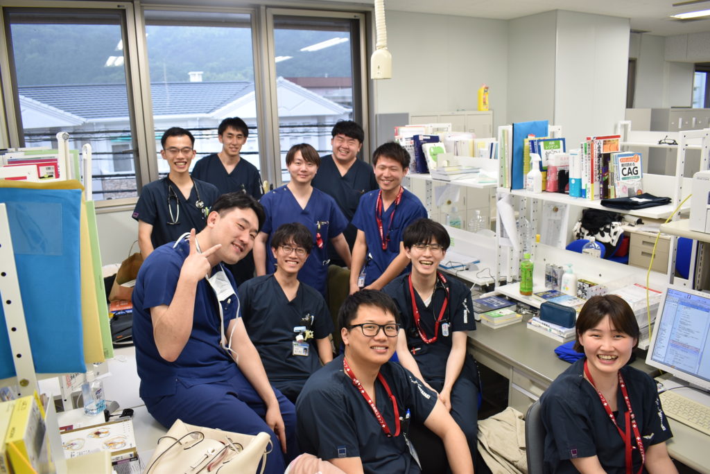 県立延岡病院の初期臨床研修は、当院基幹型のほか、宮崎県立病院群(フェニックスプログラム)、熊本大学病院、宮崎大学医学部附属病院等の臨床研修プログラムの協力型研修医に加え、研修歯科医も受け入れており、毎月10~15名程度の研修医がひとつの研修医室で互いに情報共有をし、切磋琢磨しながら研修を行っています。