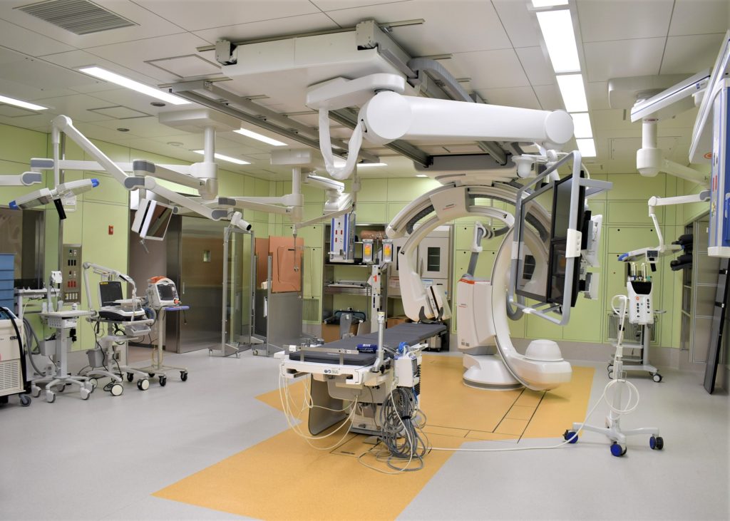 ハイブリッド手術室は、手術室と同等の空気清浄度を保ち、侵襲性の低い血管内治療(カテーテル治療)と外科手術のいずれにも対応できる手術室として整備したものです。