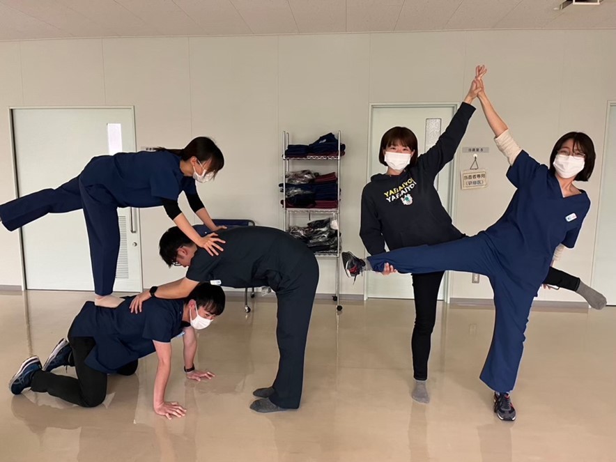 ↑ 昨年末の病院忘年会の余興に向けた組体操の練習中の写真です。