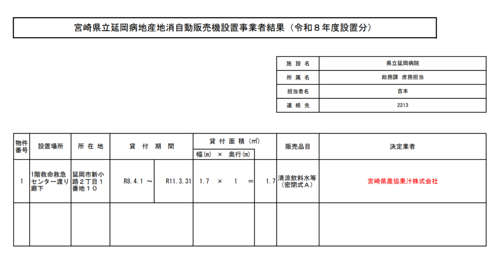 県立延岡病院自動販売機設置者(令和8年度設置分)に係る公募選定結果について