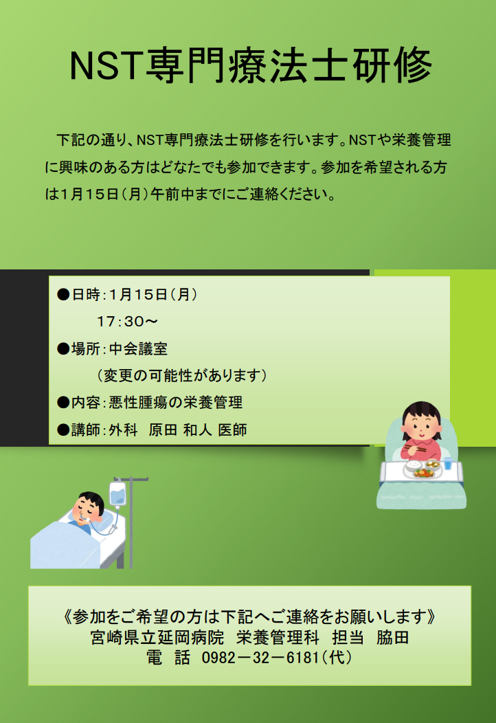 NST専任としてのチーム医療活動に興味がある方、臨床栄養について勉強したい方はぜひご参加ください。