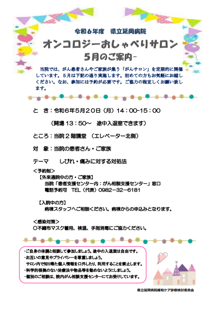 ホーム新着情報お知らせオンコロジーおしゃべりサロン-5月のご案内- オンコロジーおしゃべりサロン-5月のご案内- 2024.04.05 当院では、がん患者さんやご家族が集う「がんサロン」を定期的に開催しています。5月は下記の通り実施します。初めての方もお気軽にお越しください。なお、参加には予約が必要です。ご協力の程宜しくお願い致します。 お知らせ一覧