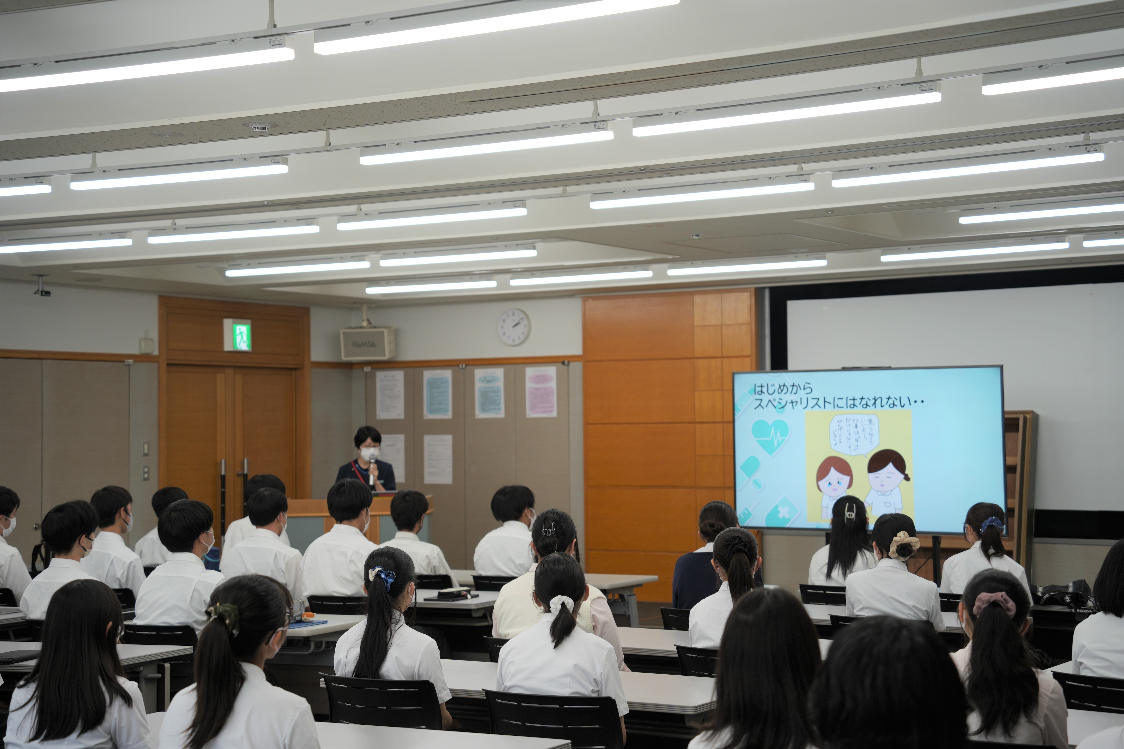 はじめに山口院長より、病院の概要や地域医療における当院の役割についてのお話があり、続いて湊副看護部長から、看護師という仕事の魅力ややりがいについて紹介しました。