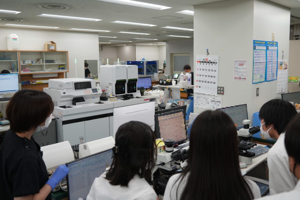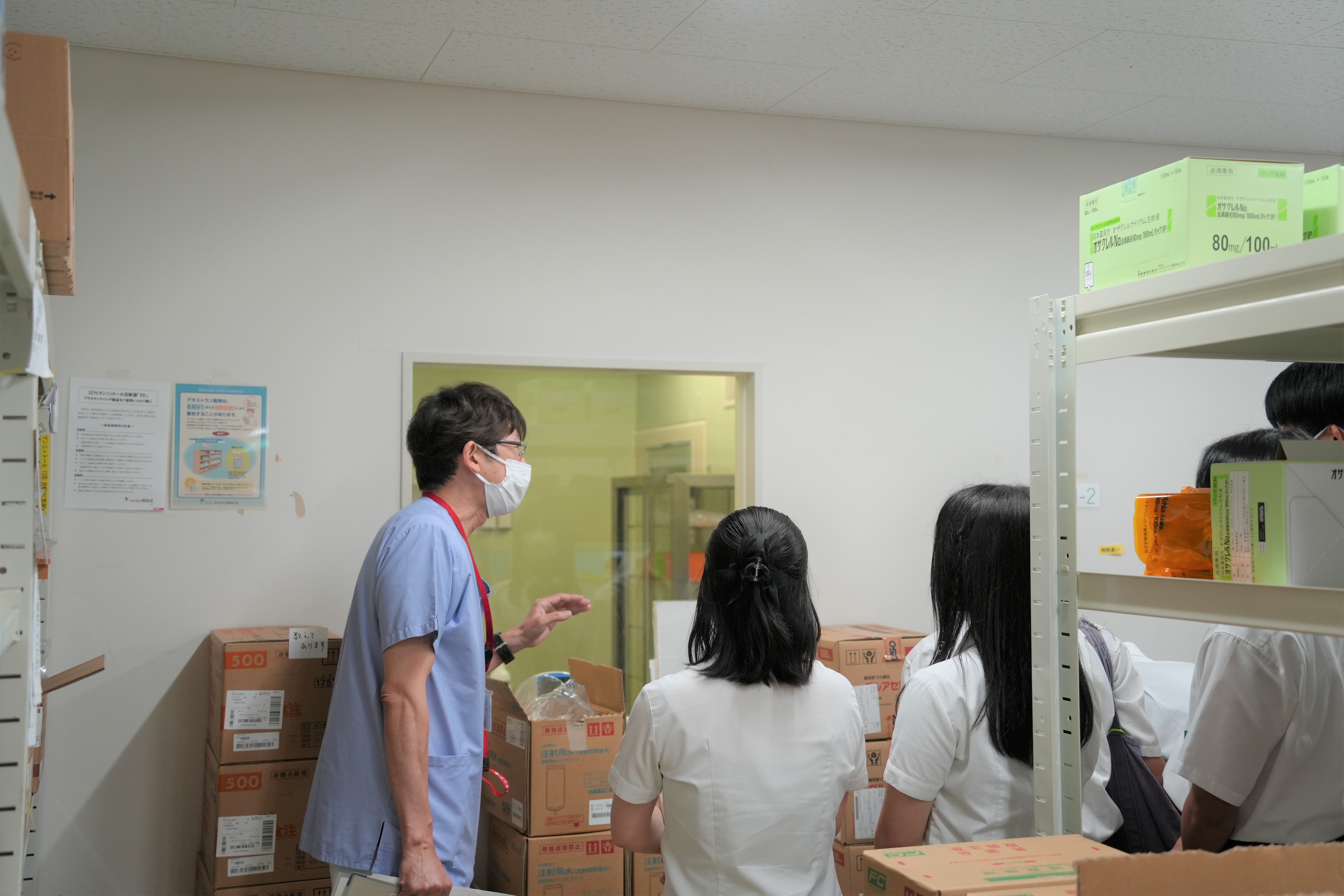 その後は、院内の各部署を見学。救命救急センターでは同校卒業生の医師・研修医・看護師が、医療人を目指したきっかけや仕事の内容について説明をしました。薬剤部では調剤の仕組みや薬剤師の仕事について、臨床検査科では検体検査や検査機器の説明を受けながら、医療を提供する上で欠かせないお仕事に触れていただきました。