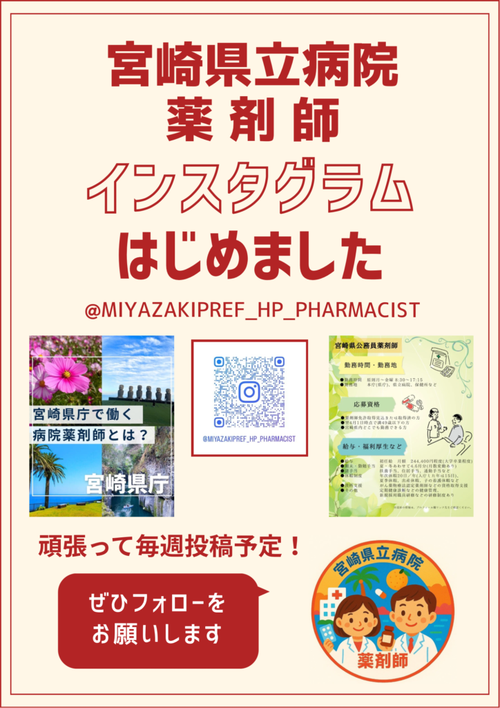 ホーム新着情報お知らせ宮崎県立延岡病院薬剤部インスタグラムはじめました! 宮崎県立延岡病院薬剤部インスタグラムはじめました! 2025.10.03 宮崎県立病院薬剤師に関する情報(業務内容・職場環境・採用情報等)を定期的に発信することになりました。 是非フォローをお願いします。 詳しくは、リンクをご覧ください。 リンクはこちら お知らせ一覧