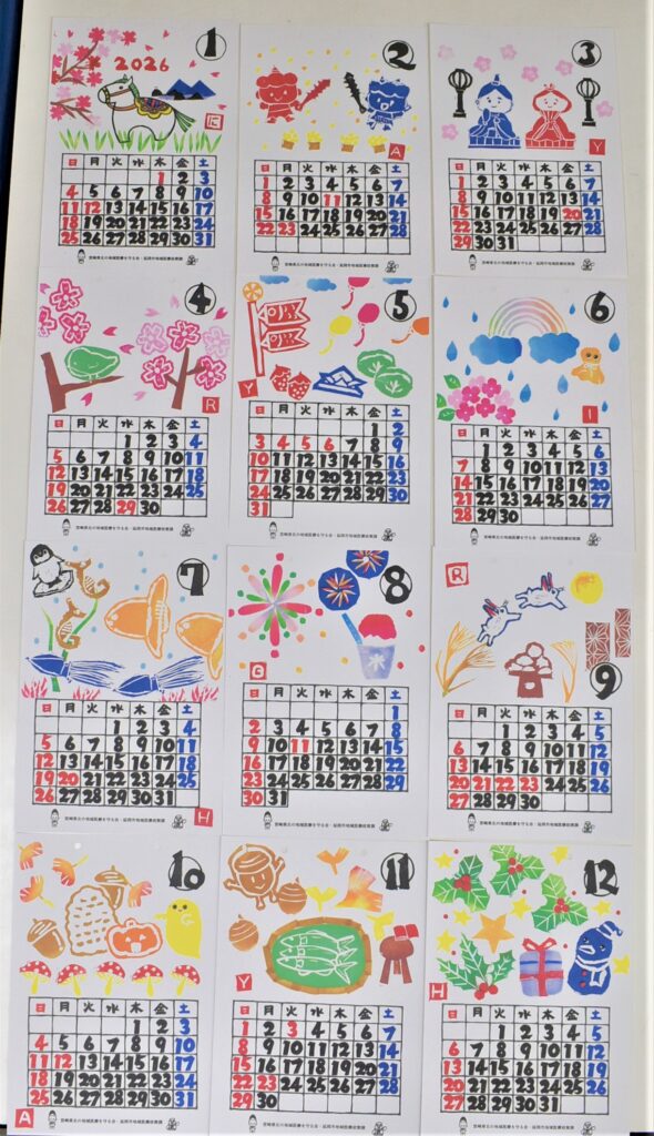 このカレンダーは、延岡市内の子どもたちが季節の風物詩を表現した消しゴムはんこで制作したもので、医療従事者への感謝の気持ちが込められた、心温まる作品となっています。