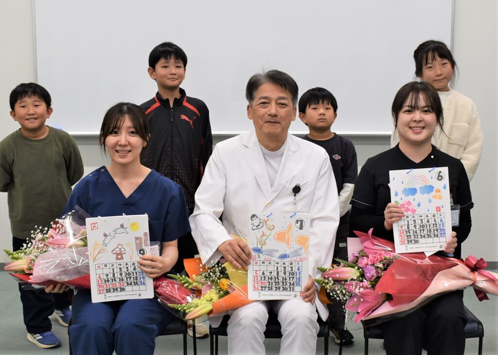 贈呈式は当院の講堂で行われ、カレンダーを制作した代表の小学生4名が来院してくださいました。子どもたちから、山口院長、小児科の保田先生、研修医の佐藤先生が、カレンダーと花束が手渡されました。