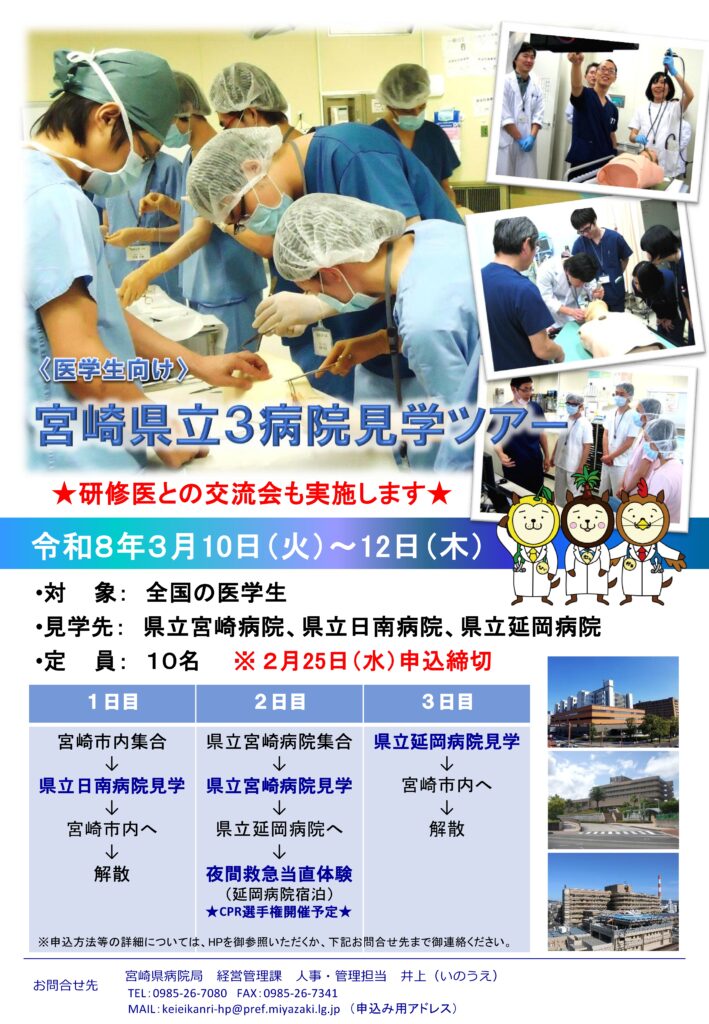 宮崎県立3病院(延岡病院・宮崎病院・日南病院)の魅力や、臨床研修プログラムの内容等をより深く知っていただくために「宮崎県立3病院見学ツアー」を開催します!
