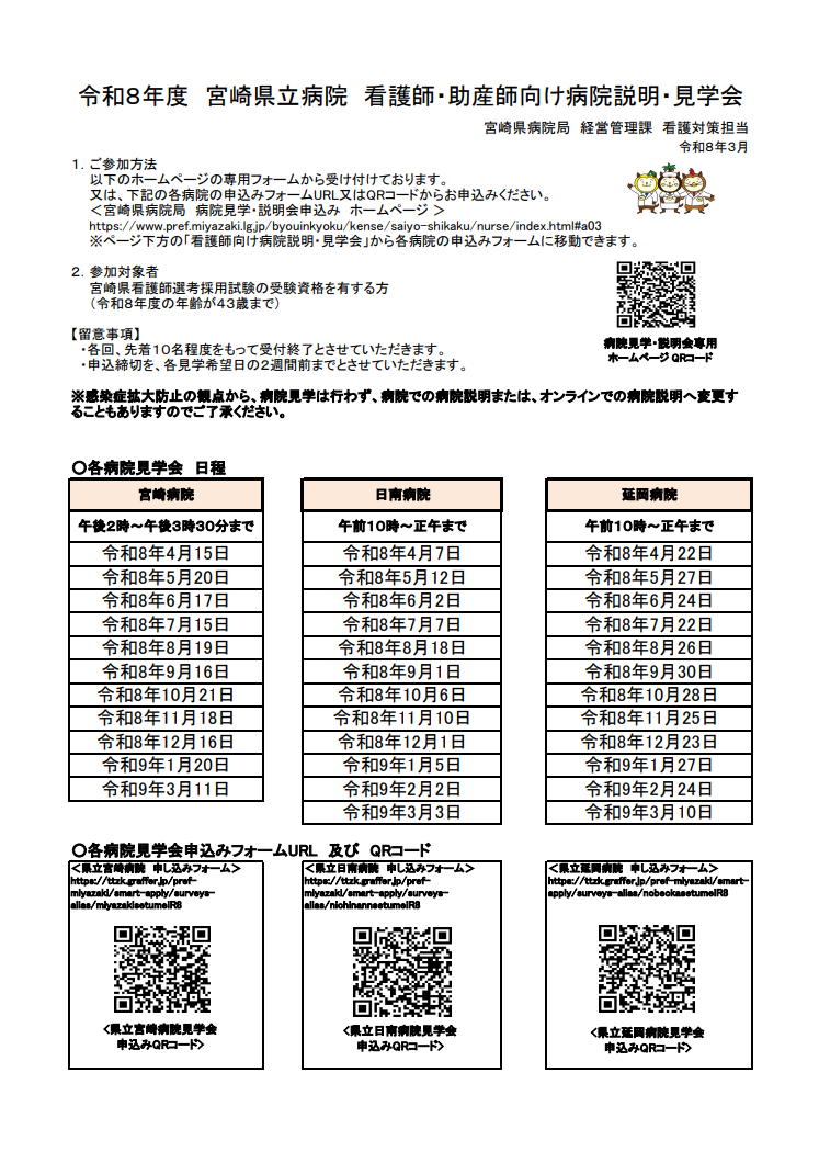 ホーム新着情報お知らせ令和8年度 看護師・看護学生向け病院説明・見学会の開催について 令和8年度 看護師・看護学生向け病院説明・見学会の開催について 2026.03.02 当院では、看護師・看護学生向けの病院説明・見学会を定期的に開催しております。 参加を希望される方は、以下のフォームからお申し込みください。 担当より折り返し連絡いたします。 看護師・看護学生向けの病院説明・見学会 お知らせ一覧