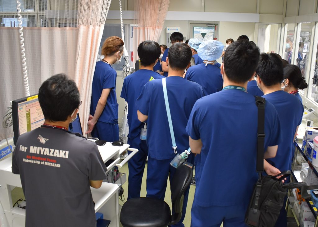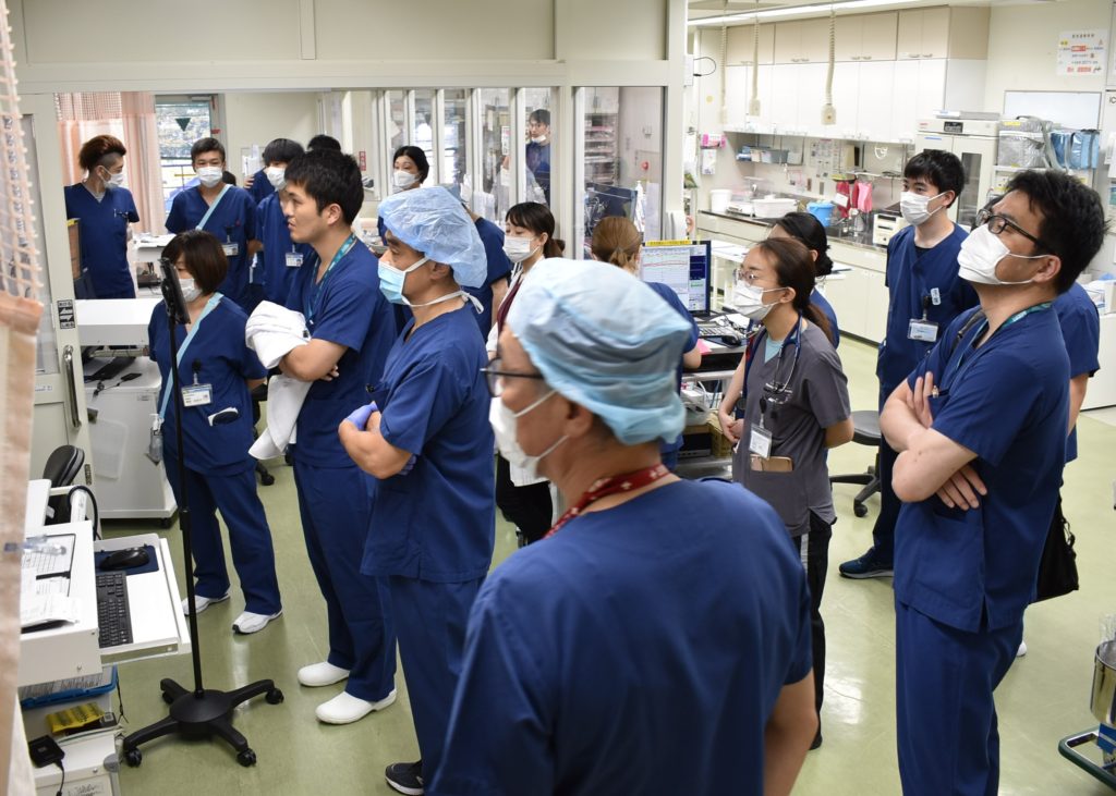 平日の朝、集中治療専門医を中心に、各診療科の医師・看護師・臨床工学技士等が一同に集い、入室中の患者さん1人1人について、カンファレンス(協議)をおこなっています。