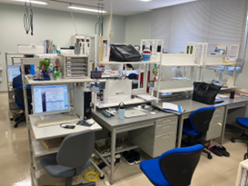 各人にデスクが割り当てられており、ロッカー、リラックスできるソファーベッドやテーブル等もあります。昨年度まではデスクに備え付けられている本棚が仕切りのようになっていたのですが、今年度から写真の通りオープンなタイプに変更して頂いたことで、雰囲気がぐっと明るくなり、部屋も広く感じられるようになったと評判です(^^)